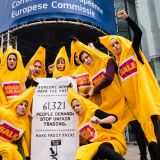 Mit einer Bananen-Aktion vor dem EU-Kommissionsgebäude in Brüssel haben die Organisationen der Make Fruit Fair!-Kampagne am 10. November ein Zeichen für fairen Handel gesetzt. Maria Rehbinder, Referatsleiterin in der EU-Kommission, nahm mehr als 61.000 Unterschriften für die Petition „Stoppt unfairen Handel“ entgegen.